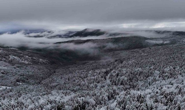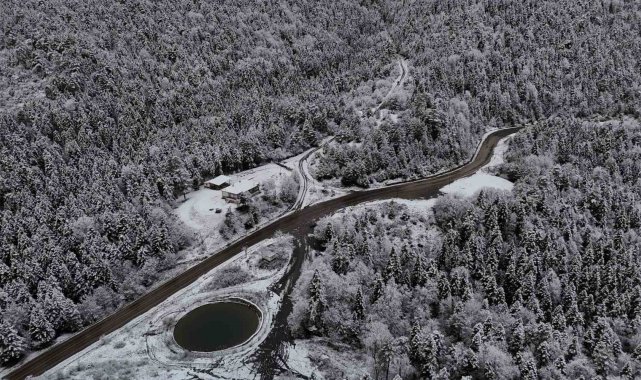 Kar yağışının etkili olduğu ormanlık alanlarda oluşan doğal güzellikler havadan görüntülenirken, karla kaplanan ağaçlar seyirlik manzaralar oluşturdu.