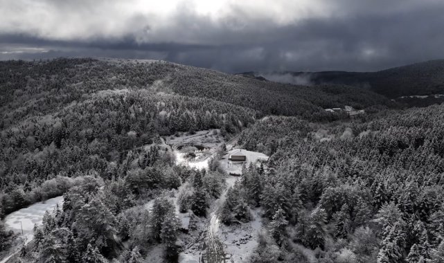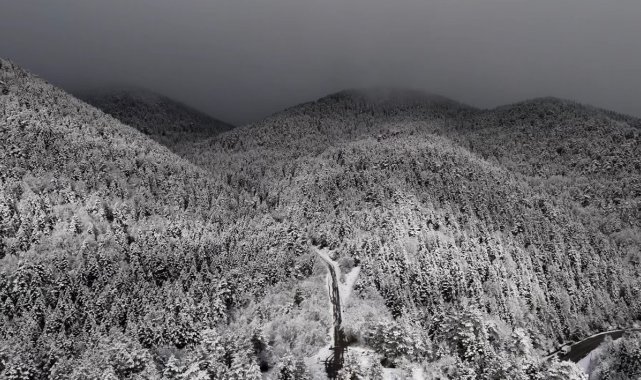 Karabük'ün yüksek kesimlerinde etkili olan kar yağışıyla birlikte ormanlık alanlar beyaza bürünürken, ortaya çıkan kartpostallık manzaralar dronla görüntülendi.