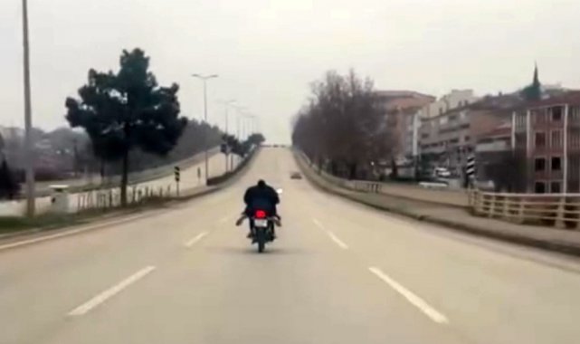 Karabük'te, motosikleti yüzüstü yatarak kullanan kasksız sürücü, cep telefonu kamerasıyla görüntülendi