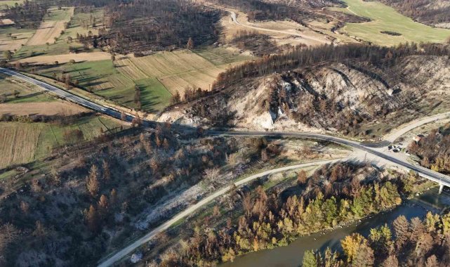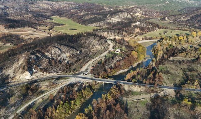 Karabük-Ovacık kara yolunun Hocalı Köprüsü mevkiinde kaydedilen görüntülerde, yangın nedeniyle siyaha dönen ağaçlarla birlikte sonbahar renklerine bürünen ağaçların oluşturduğu doğal kontrast dikkat çekti.