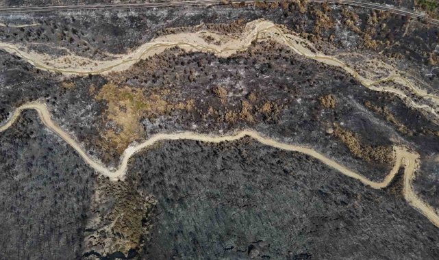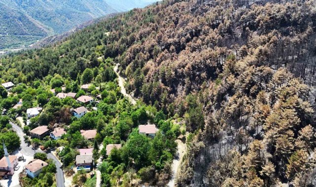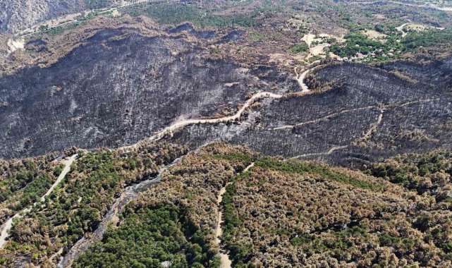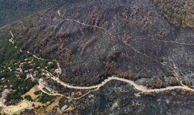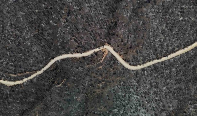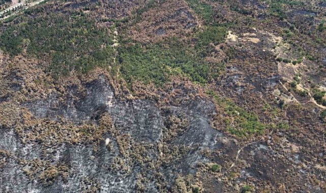 Dronla kaydedilen görüntülerde, yeşilin canlılığını kaybettiği, yer yer tamamen siyaha dönen alanların geniş bir coğrafyaya yayıldığı tespit edildi. Özellikle sararan ağaç yaprakları, kuruyan fidanlar ve is tutmuş topraklar, yangının doğaya verdiği zararı gözler önüne serdi.
