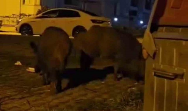 Karabük Mahallesi Gazi Aytekin Caddesi ile Emek Mahallesi'nde aç kalan domuzlar yiyecek ararken cep telefonu kameralarıyla kaydedildi.