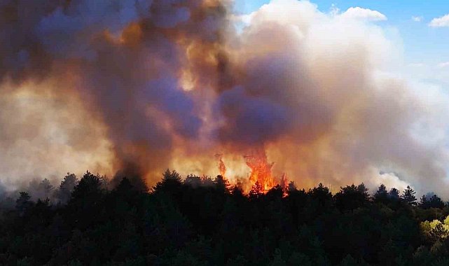 48 saattir arazöz ve itfaiye ekiplerinin de karadan müdahalesi sürerken, alevler ve yoğun duman dronla havadan görüntülendi.