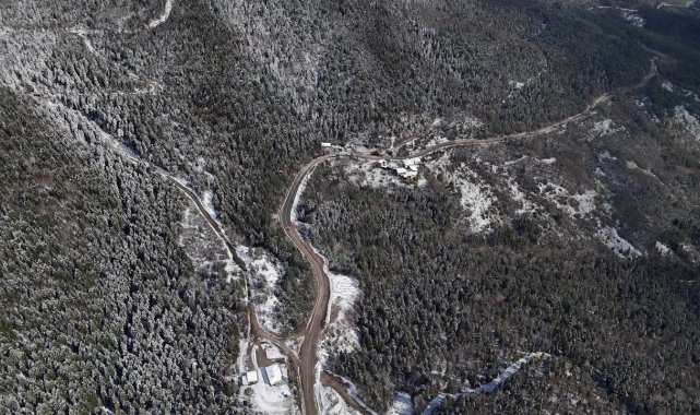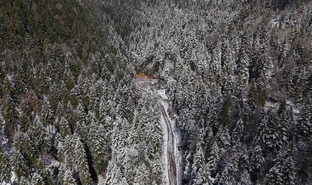 Karabük-Bartın kara yolunda etkili olan kar yağışı sonrası oluşan beyaz örtü dronla görüntülendi.