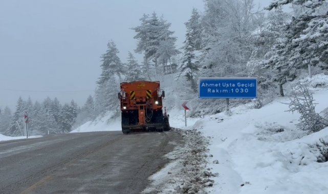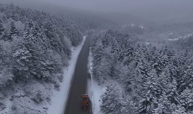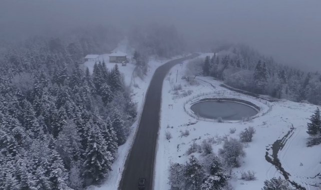 Kar yağışı ve sisin etkili olduğu bölgede oluşan manzara havadan görüntülenirken, Karayolları ekipleri de ulaşımda aksama yaşanmaması için kar küreme ve tuzlama çalışması gerçekleştirdi.