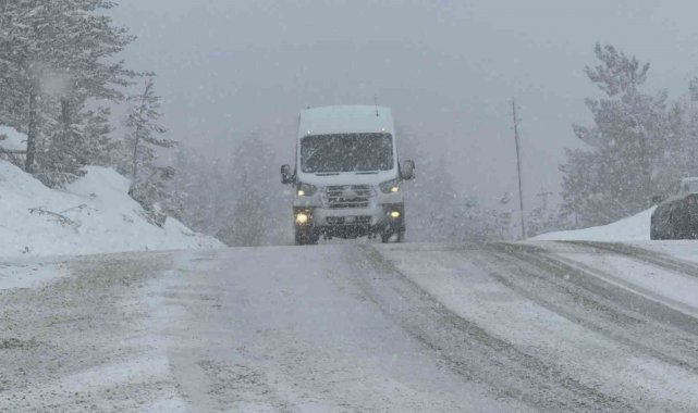 Kar yağışının etkili olduğu bölgede sürücülerin dikkatli ilerlediği, düşük hızda seyrettikleri görülüyor.