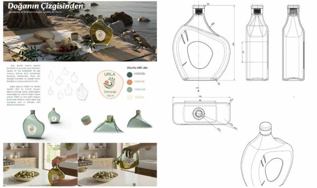 Safranbolu Fethi Toker Güzel Sanatlar ve Tasarım Fakültesi Endüstriyel Tasarım Bölümü öğrencisi Feyza Sinem Taş'ın yarışmada finale kalan çalışması, Urla'nın deniz kabuklarıyla bezeli kıyılarından ve zeytin ağacının köklü kültüründen ilham alıyor. Organik formu ve doğal renk tercihleriyle zeytinyağının akışkanlığını ve bölgenin sakin atmosferini yansıtan tasarım, etiket bölümünde zeytin yeşili, Ege toprağının kızılı ve nötr kabuk tonlarıyla bütünleşiyor.