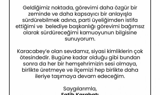 31 Mart 2024 gerçekleştirilen yerel seçimlerde İYİ Parti'den aday olarak Karacabey Belediye Başkanı seçilen Fatih Karabatı, partisinden istifa etti. Karabatı, sosyal medya hesabından yayınladığı açıklamada, "Karacabey'e hizmet etmek amacıyla üstlendiğim belediye başkanlığı görevimde bir yılı geride bırakırken, tüm kararlarımı vatandaşlarımızın menfaatlerini gözeterek almaya özen gösterdim. Geldiğimiz noktada görevimi daha özgür bir zeminde ve daha kapsayıcı bir anlayışla sürdürebilmek adına, parti üyeliğimden istifa ettiğimi ve belediye başkanlığı görevimi bağımsız olarak sürdüreceğimi kamuoyunun bilgisine sunuyorum. Karacabey'e olan sevdamız, siyasi kimliklerin çok ötesindedir. Bugüne kadar olduğu gibi bundan sonra da her bir hemşehrimizin sesi olmaya, birlikte üretmeye ve ilçemizi hep birlikte daha ileriye taşımaya devam edeceğim" dedi.