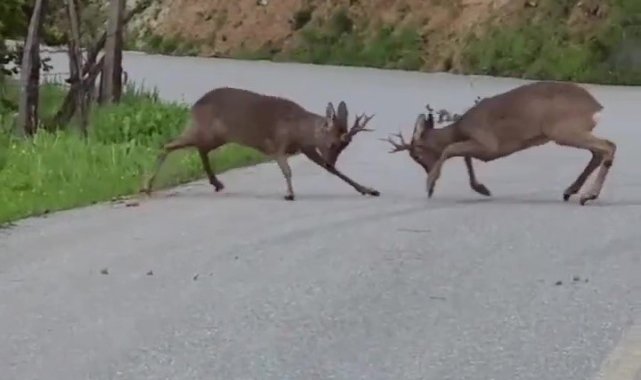 Düzce'de yol üzerinde iki karacanın birbirlerini boynuzları ile ittirdiği kavga kameralara yansıdı.