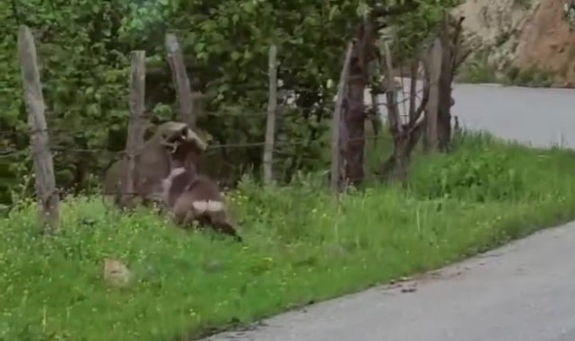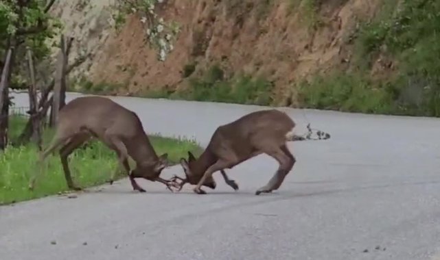 Cumayeri ilçesinin yüksek kesimlerinde seyreden aracın sürücüsü, yol üzerinde iki karacanın birbirlerine boynuzlarını vurararak saldırdığını fark etti. Hayvanları
