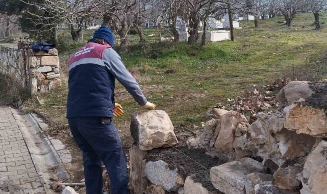Karacasu'da mezarlığın yıkılan duvarı onarıldı