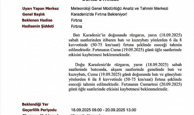 MGM Analiz ve Tahmin Merkezi tarafından 'Deniz Uyarısı' başlığıyla yapılan uyarıda Batı Karadeniz'in doğusunda rüzgarın, yarın (18.09.2025) sabah saatlerinden itibaren batı ve kuzeybatı yönlerden 6 ila 8 kuvvetinde (50-75 km/saat) fırtına şeklinde eseceğinin tahmin edildiği belirtildi. Fırtınanın cuma (19.09.2025) günü öğle saatlerinde etkisini kaybetmesinin beklendiği ifade edildi.