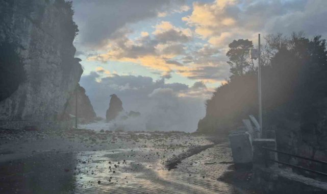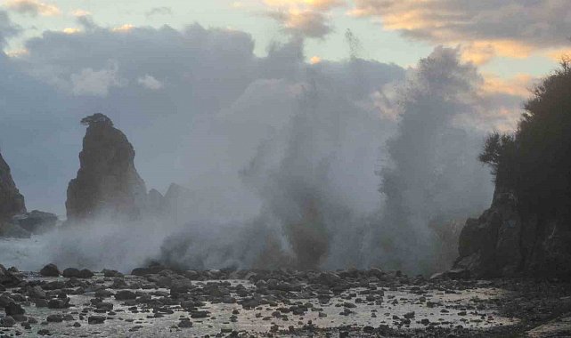 Metrelerce yükseklikteki kayalara çarpan dalgalar sahil kenarındaki otoparka kadar ulaştı. Dalgalar otoparkın bir bölümünü suyla doldurdu.