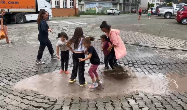 Karadeniz Bölgesi'nde etkili olan sağanak yağışlar, Artvin'in Hopa ilçesinde farklı görüntülere neden oldu. İlçedeki bir meydanda yağmurun ardından oluşan su birikintilerini gören çocuklar, çamurlu su içinde oynamaya başladı. Bazı anneler de çocuklarına eşlik ederek çamurlu su da zıpladı. Tereddütsüzce suya atlayan çocukların neşesi kameralara yansıdı. Cep telefonu ile kaydedilen görüntülerde, annelerin de çocuklarla birlikte eğlendiği görüldü.
