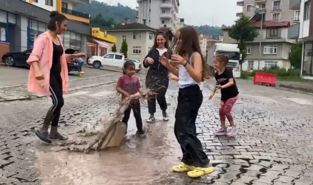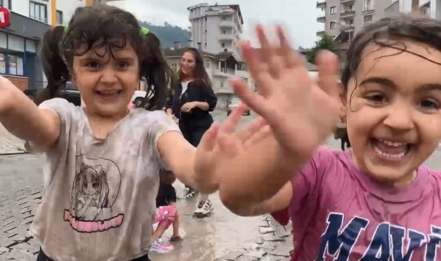 Artvin'in Hopa ilçesinde yağmur sonrası oluşan su birikintileri çocukların eğlencesine sahne oldu. Çocuklara anneleri de eşlik etti. O anlar cep telefonu kameralarıyla kaydedildi.