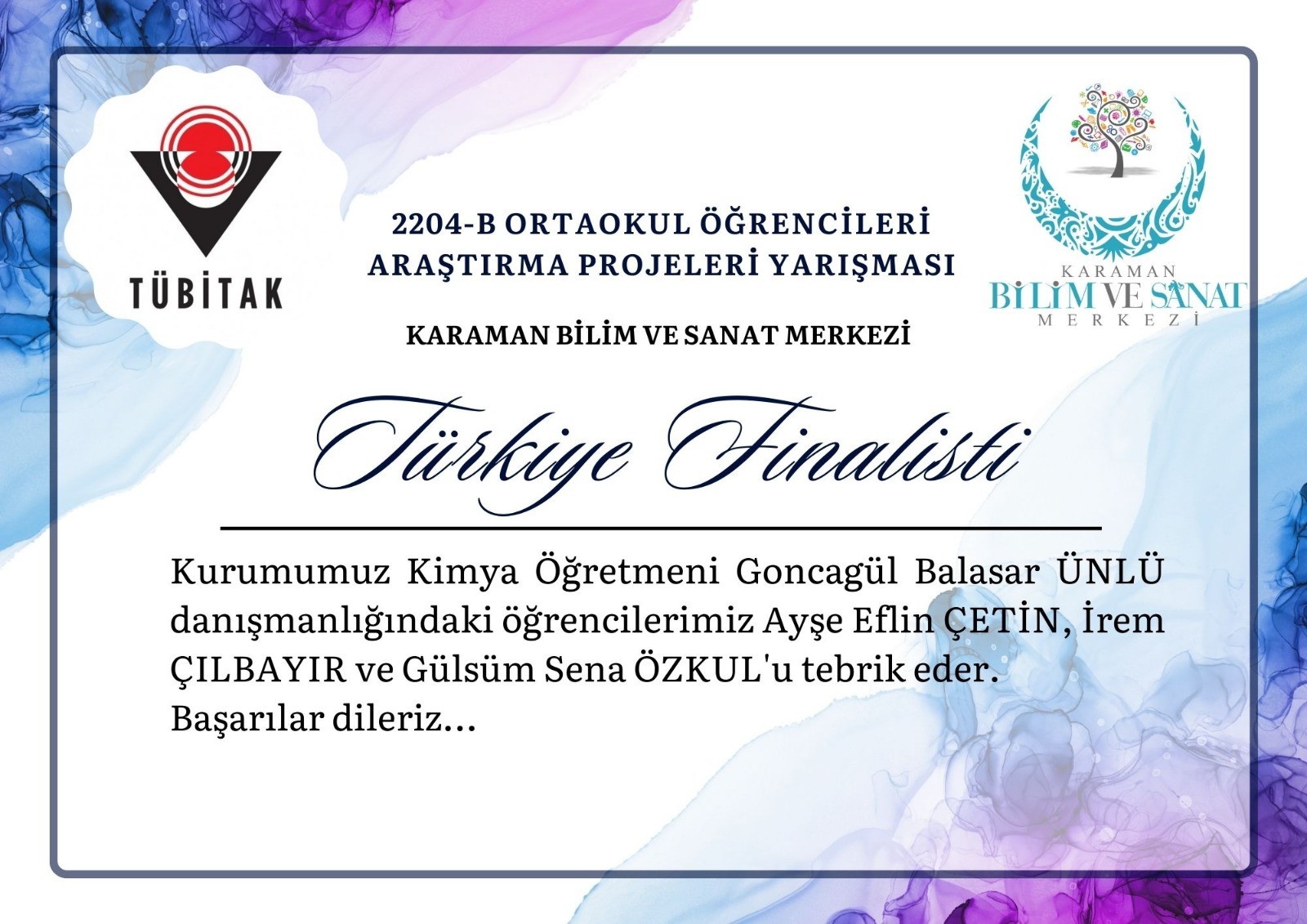 TÜBİTAK’ın düzenlemiş olduğu 17. Ortaokul Öğrencileri Araştırma Projeleri Yarışmasına 12.053 kız ve 9.078 erkek öğrenci olmak üzere toplam 21.131 öğrencinin hazırladığı 14.883 proje arasından Karaman Bilim ve Sanat Merkezi öğretmeni Goncagül Balasar ÜNLÜ danışmanlığında Karaman Bilsem Öğrencileri Ayşe Eflin ÇETİN, İrem CILBAYIR, ve Gülsüm Sena ÖZKUL tarafından hazırlanan proje bölge birincisi olarak Türkiye finalinde ilimizi temsil etmeye hak kazandı. Tübitak 2204-A Lise Öğrencileri Proje Yarışmasındaki bölge birinciliği ve Türkiye Finalisti olmasının ardından, Tübitak 2204-B Ortaokul Öğrencileri Proje yarışmasında da Bölge Birincisi ve Türkiye Finalisti oldu. Böylece, 5-9 Haziran tarihleri arasında Ankara’da yapılacak Türkiye Finali’nde 2 proje ile ilimizi temsil etme hakkını kazandı. Ayrıca bu yıl Karaman Bilim ve Sanat Merkezi’nden 3 patent başvurusu da yapılarak bir başarı daha elde edildi.