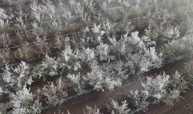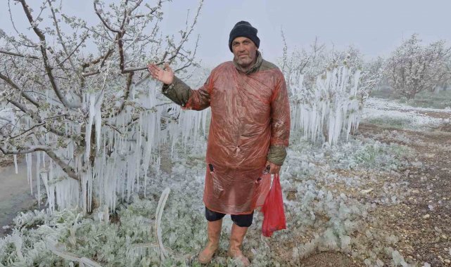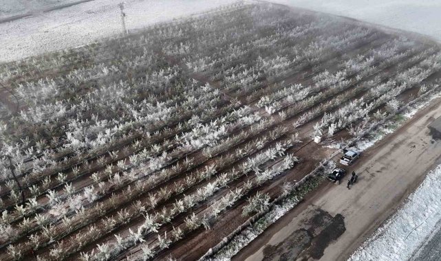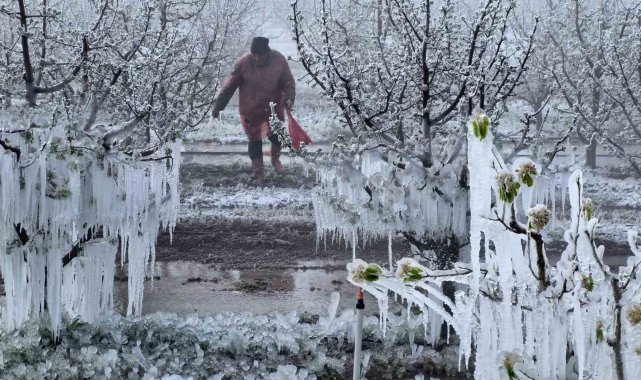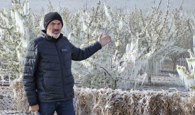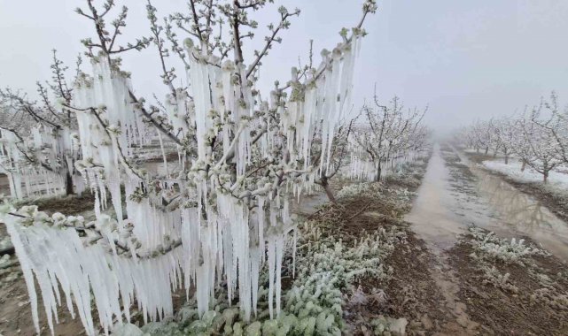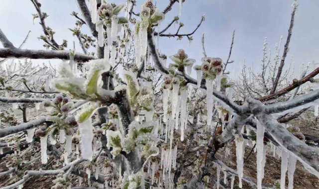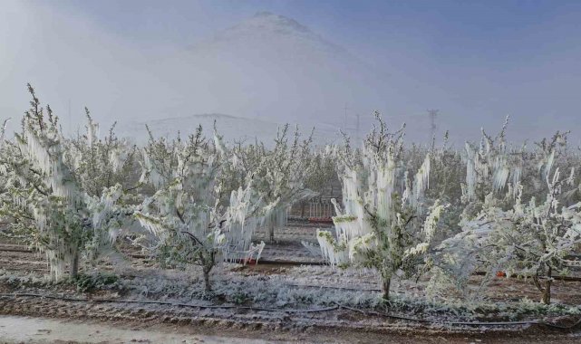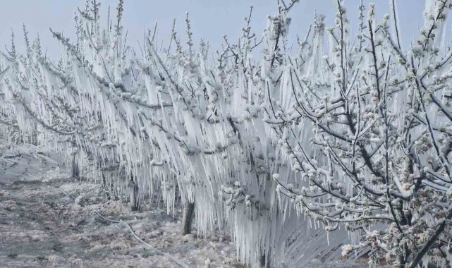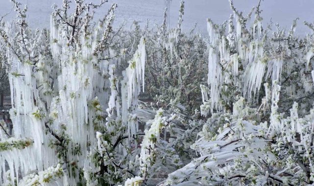 Karaman'da çiçek açan milyonlarca elma ağacını don vurdu. Dona karşı sulama yapılan bahçelerdeki elma ağaçlarının tamamen buz tutması adete buzulları hatırlattı.