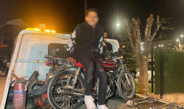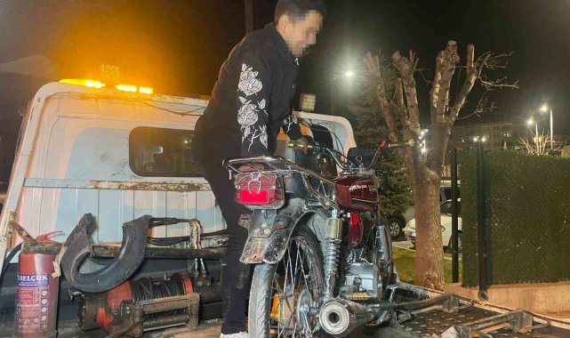 Olay, gece saat 22.00 sıralarında İmaret Mahallesi 169. Sokak'ta yaşandı. Edinilen bilgiye göre, devriye görevi yapan gece bekçileri İbiş K.'nin (18) kullandığı motosikleti durdurdu. Trafik polisleri tarafından yapılan kontrollerde, sürücünün ehliyetine daha önceden el konulduğu, motosiklette ise plakasız ve abartı egzoz takılı olduğu tespit edildi.