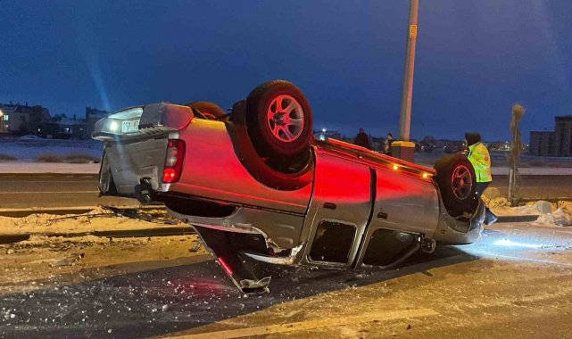 Karaman'da buzlanma nedeniyle kontrolden çıkan kamyonetin refüje çarparak devrilmesi sonucu 2 kişi yaralandı.