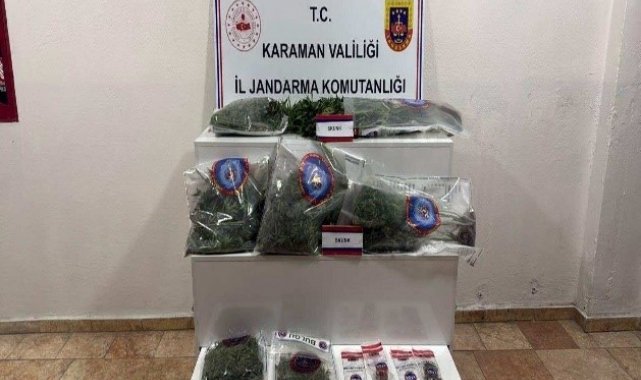 Karaman'da jandarmanın yaptığı uygulamalarda el yapımı dinamitler ile kaçan tütün ve uyuşturucular ele geçirilirken, aranan 6 kişi tutuklandı.