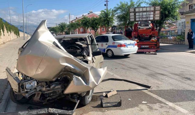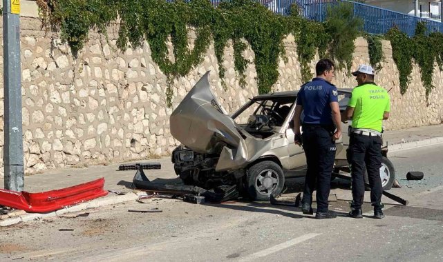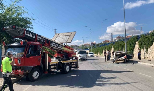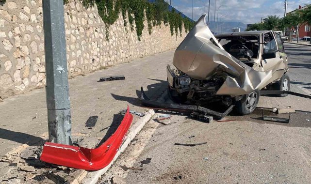 Karaman'da önce solladığı kamyonete sonra da aydınlatma direğine çarpan otomobil sürücüsü yaralandı.