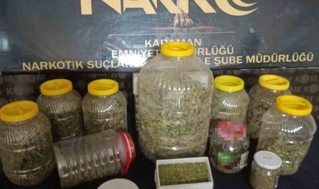 Edinilen bilgiye göre, Karaman İl Emniyet Müdürlüğü Narkotik Suçlarla Mücadele Şube Müdürlüğü ekipleri, uyuşturucu madde ticareti ve kullanılmasının önlenmesine yönelik yürüttüğü çalışmada T.D., isimli şahsın evinde uyuşturucu madde bulunduğu bilgisine ulaştı. Cumhuriyet Başsavcılığı'nın talimatıyla harekete geçen ekipler, şahsın şehir merkezindeki ikametinde Daisy isimli narkotik köpeğiyle yaptığı aramada plastik bidonlara koyulmuş 1 kilo 492 gram esrar, 165 gram kenevir tohumu ve hassas terazi ele geçirildi.
