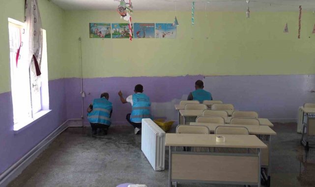 Karaman'ın Ermenek ilçesinde Denetimli Serbestlik Müdürlüğü koordinasyonunda yükümlüler köy okullarının boya ve temizlik işlerini yaparak eğitime katkı sağlıyor.
