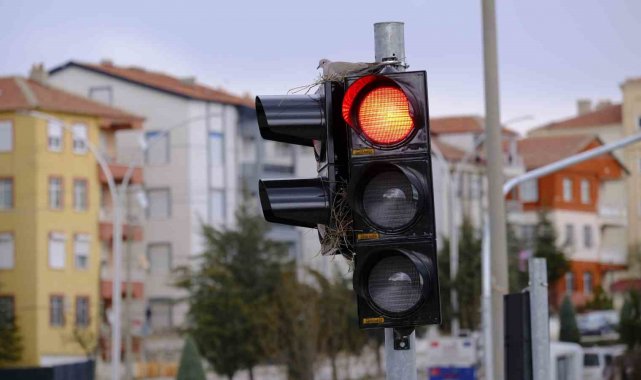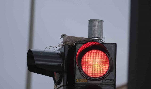 Karaman'ın en işlek kavşağındaki trafik lambasına yuva yapan kumru görenleri şaşırtıyor