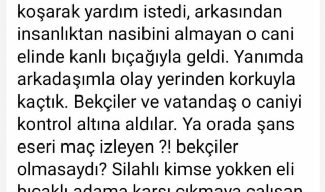 Olayın ardından yaşananlara şahit olan bir vatandaş, "Eşimin arkadaşlarıyla halı sahasını izlemeye gittim. Yaralanan vatandaş kanlar içerisinde koşarak yardım istedi. Arkasından insanlıktan nasibini almamış o cani elinde kanlı bıçağı ile geldi. Yanımda arkadaşımla olay yerinden kaçtık. Bekçiler caniyi gözaltına aldı. Ambulans çok geç geldi. Olaydan 20 dakika sonra geldiler. Eğer o genç adama bir şey olursa, sorumlusu geç gelen ambulanstır" dedi.