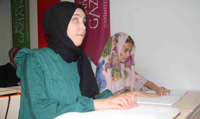 Görme engelli öğrencilerin Kur'an-ı Kerim'i parmaklarıyla öğrendikleri kursta kursiyerlerin bu anlamda gösterdikleri azim ve fedakarlıkları imrendiriyor. Servis aracıyla evlerinden tek tek alınan ve Gaziantep Büyükşehir Belediyesi Engelli Koordinasyon Merkezi'ne getirilen görme engelli öğrenciler, engellerini bir kenara bırakarak ve sırt sırta vererek, uzman eğitmen eşliğinde Braille alfabesiyle Kur'an-ı Kerim dersi alıyor.