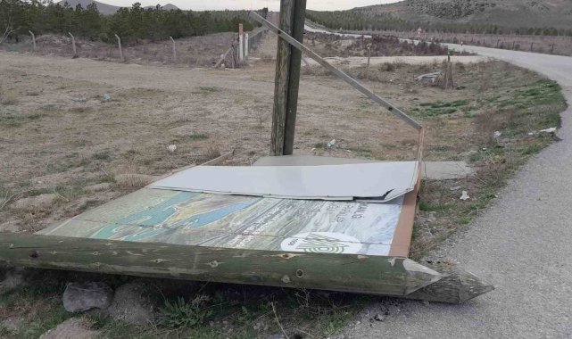 Konya'nın Karapınar ilçesinde beklenen lodos fırtınası etkisini göstermeye başlarken şiddetli rüzgar nedeniyle Meke Gölü girişindeki tanıtım levhası devrildi.