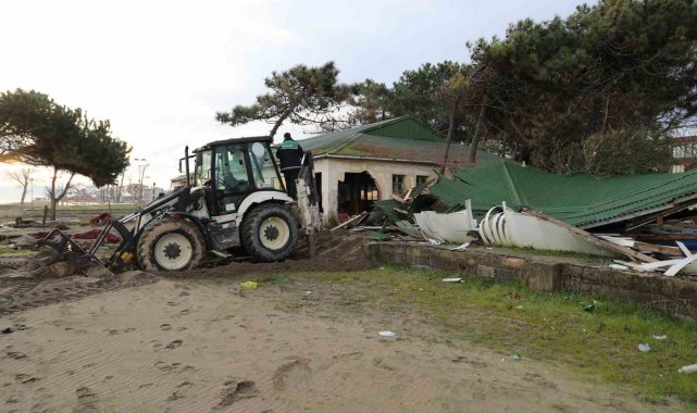 Karasu'da "riskli alan" ilan edilen bölgedeki binalar için kepçeler sahile indi
