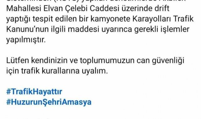 Amasya'da karlı yolda kamyonetiyle drift attığı belirlenen sürücü polis kameralarına yakalandı. Amasya Valiliği o tehlikeli görüntüleri, "Gereği yapıldı. 27 saniyelik bilinçsiz bir heyecanın maliyeti 58 bin 217 TL idari para cezası, 60 gün trafikten men" notuyla paylaştı. 1 Ocak 2026 günü Amasya Emniyet Müdürlüğü ekiplerince Kent Güvenlik Yönetim Sisteminden (KGYS) yapılan denetimlerde Akbilek Mahallesi Elvan Çelebi Caddesi üzerinde drift yaptığı tespit edilen bir kamyonete karayolları trafik kanununun ilgili maddesi uyarınca gerekli işlemler yapıldığı bildirildi. Amasya Valiliği açıkladı 27 saniyelik bilinçsiz bir heyecanın maliyetinin 58 bin 217 TL idari para cezası ve 60 gün trafikten men olduğunu açıklayan Amasya Valiliği sürücülere, "Lütfen kendinizin ve toplumumuzun can güvenliği için trafik kurallarına uyalım" tavsiyesinde bulundu.