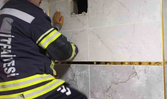 Erzurum'da bir evin havalandırma boşluğuna giren ve burada mahsur kalan kavga yavrusu, itfaiye ekipleri tarafından kurtarıldı.