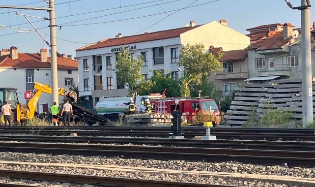 Kargaların demiryolu hattında elektrik kablolarına teması yangın çıkarttı