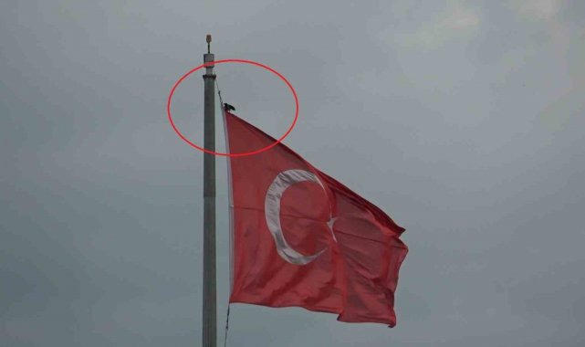 Cumhuriyet Meydanı'ndaki göndere asılı Türk bayrağı sert rüzgarda dalgalanırken, bir karga bayrağın üzerine konmak için dakikalarca mücadele verdi. Rüzgarın etkisiyle defalarca havalanmak zorunda kalan karga, her seferinde yeniden dönerek bayrağa tutunmaya çalıştı. Zaman zaman havada dönerek yeniden yaklaşan karga, rüzgarın şiddetine rağmen birkaç kez bayrağın üzerine konmayı başardı. Karganın ısrarlı mücadelesi hem eğlenceli hem de ilginç görüntüler oluşturdu.