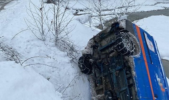 Sinop'un Türkeli ilçesinde, kar ve buzlanma nedeniyle kargo minibüsü yoldan çıkarak dereye uçtu.