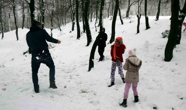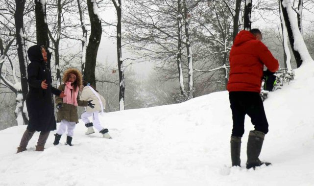 Sakarya'da lapa lapa yağan kar sonrasında ailesiyle yüksek kesimlere çıkan çocuklar, kar topu oynayıp kayak yaparak anın tadını çıkardı.