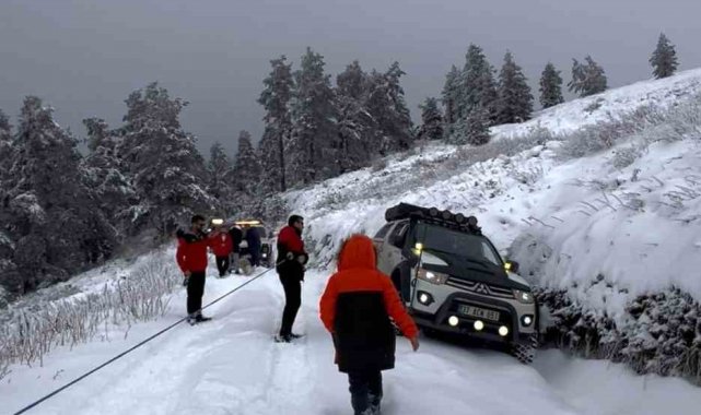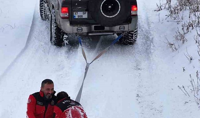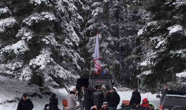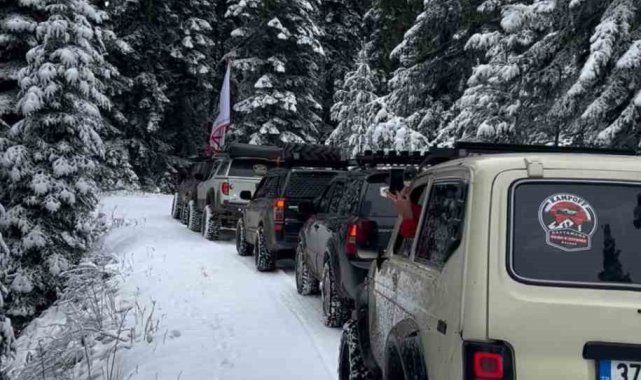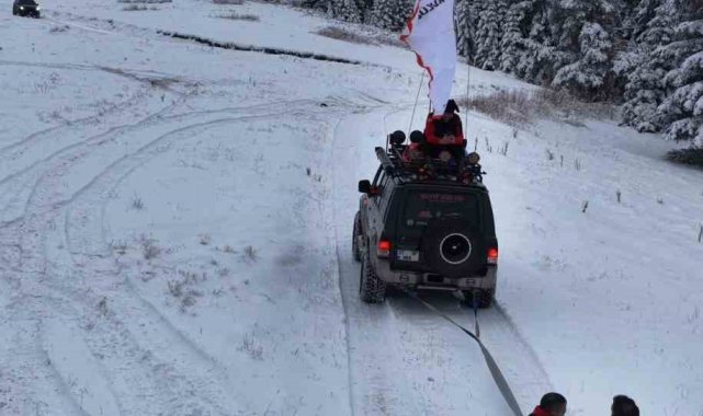 Kastamonu'da kar yağışıyla beyaza bürünen Ilgaz Dağı'na giden doğaseverler, off-road araçlarının arkasına bağladıkları lastikle kayarak eğlendi.