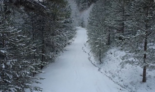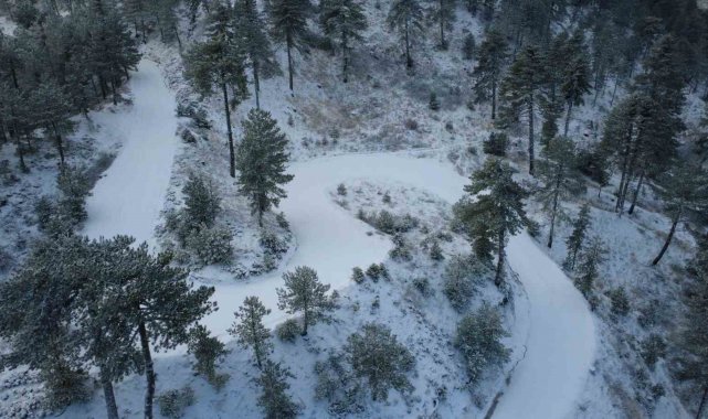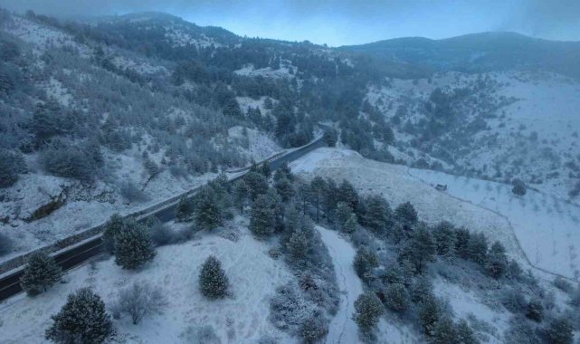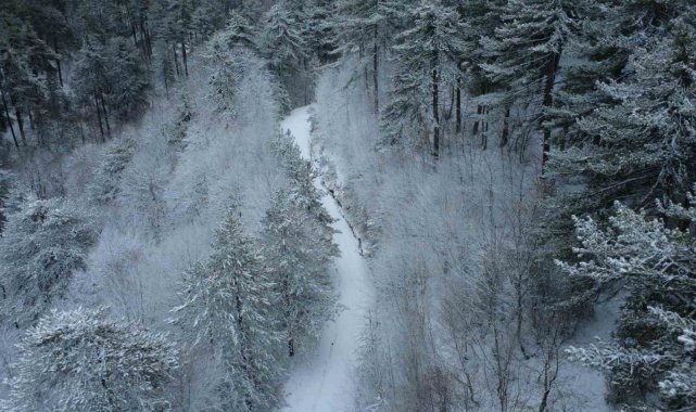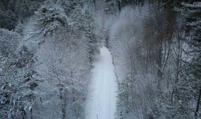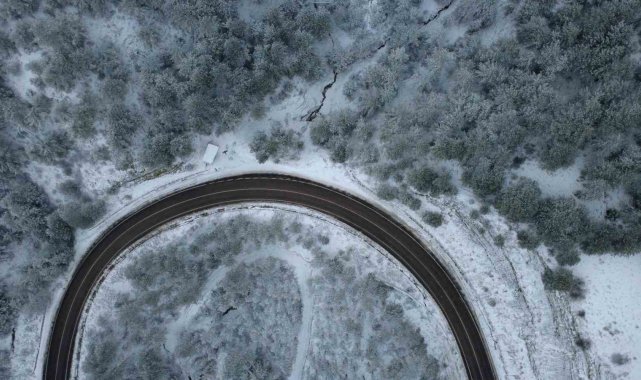 Drone ile kaydedilen görüntülerde, karla kaplanan dağ silsileleri, ormanlık alanlar ve kıvrılarak uzanan yollar görsel bir şölen sundu.