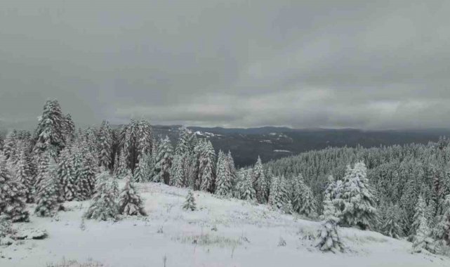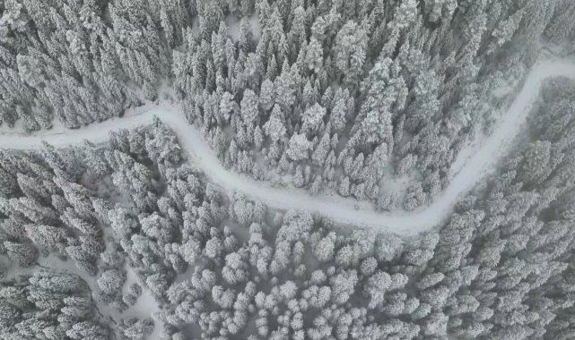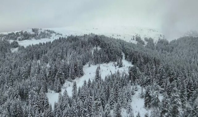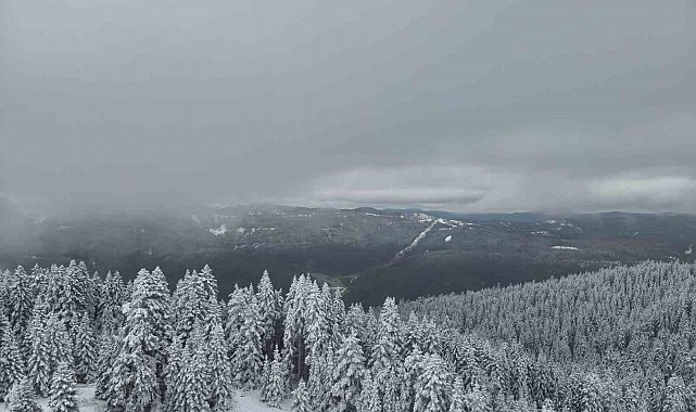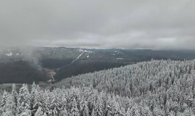 Kar yağışıyla beyaza bürünen Ilgaz Dağı, havadan görüntülendi.