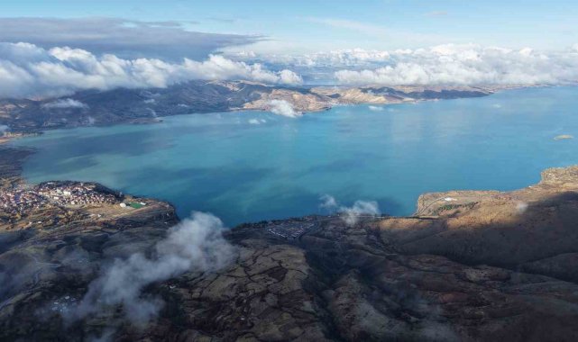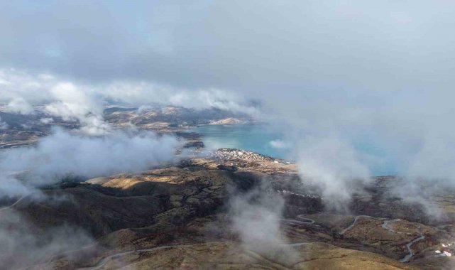 Elazığ'da karla kaplı Hazarbaba Dağı ve eteğindeki Hazar Gölü, bulutlarla birlikte kartpostallık görüntüler oluşturdu.
