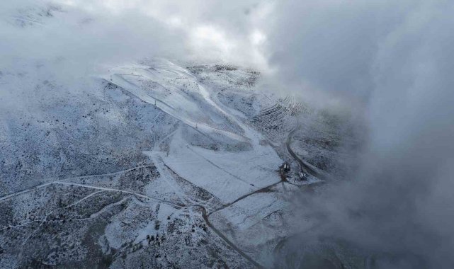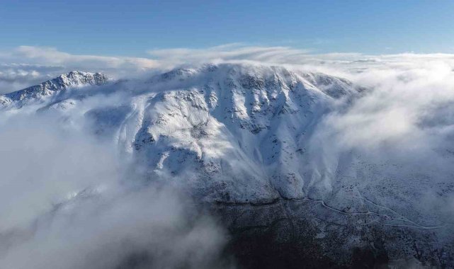 Elazığ'da soğuk havayla birlikte önceki gün 2 bin 347 rakımlı Hazarbaba Dağı'na kar yağdı. Dağ ve etekleri beyaza bürünürken, Hazar Gölü ise mavi tonuyla dikkat çekti. Bulutların ve sisin de hakim olduğu bölgede adeta kartpostallık görüntüler oluştu. Dron ile çekilen görüntüler izleyenleri kendine hayran bıraktı. Bazı vatandaşlar ise Hazarbaba Dağı'na çıkarak manzaranın keyfini yaşadı.