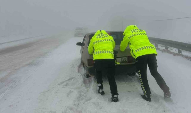 Karla kaplı yollarda mahsur kalan vatandaşların yardımına polis koştu