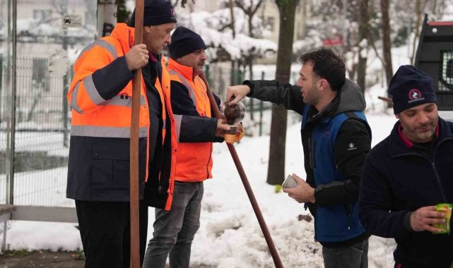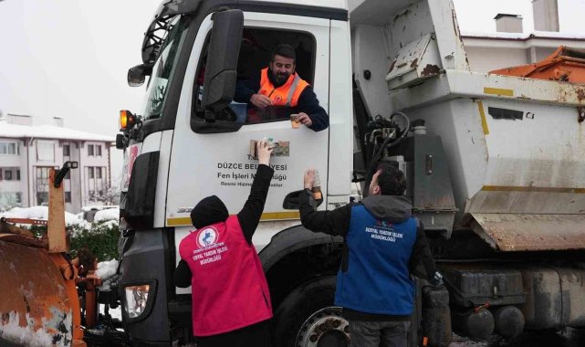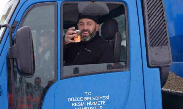 Düzce'de hafta sonundan itibaren yaşanan etkili olan kar yağışında mücadele eden Düzce Belediyesi kar timlerine sıcak çay ve kek ikramı yapıldı.