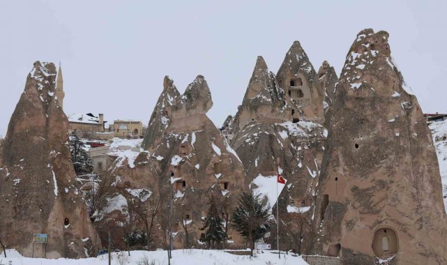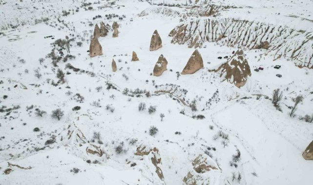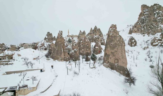 UNESCO Dünya Kültür Mirası Listesi'nde yer alan Kapadokya bölgesinde yağan yoğun kar yağışının ardından peribacaları ortaya kartpostallık görüntüler çıkarttı.