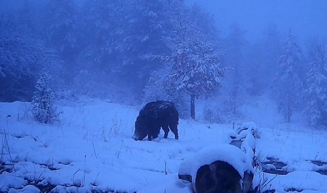 Karlı havada yiyecek arayan domuzun görüntüleri kameraya yansıdı