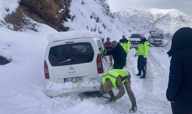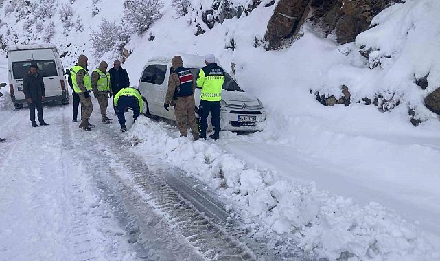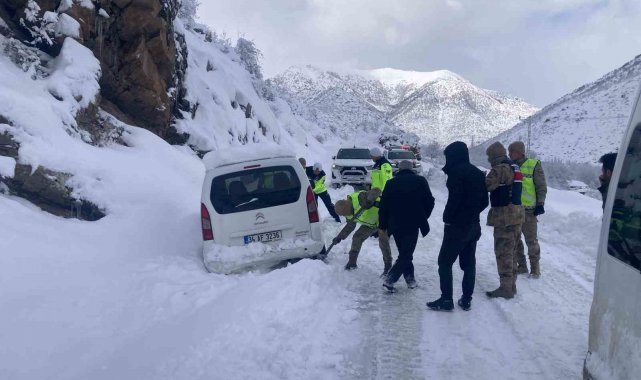Bitlis'in Tatvan ilçesinde kar nedeniyle araçları yoldan çıkarak mahsur kalan vatandaşların imdadına Mehmetçik yetişti.