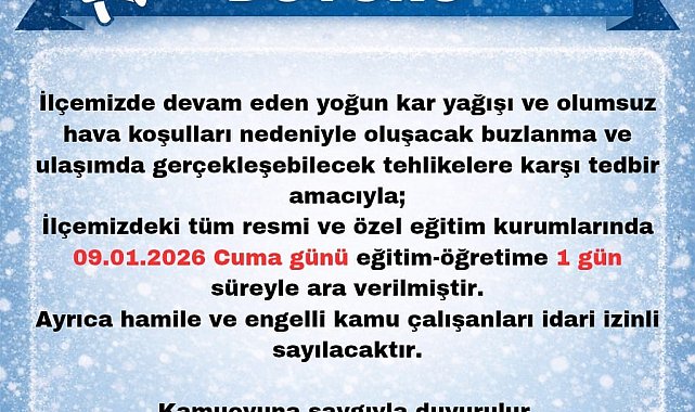 Karlıova Kaymakamlığı tarafından yapılan açıklamada, "İlçemizde devam eden yoğun kar yağışı ve olumsuz hava koşulları nedeniyle oluşacak buzlanma ve ulaşımda gerçekleşebilecek tehlikelere karşı tedbir amacıyla; ilçemizdeki tüm resmi ve özel eğitim kurumlarında 9 Ocak 2026 Cuma günü eğitim-öğretime 1 gün süreyle ara verilmiştir. Ayrıca hamile ve engelli kamu çalışanları idari izinli sayılacaktır" denildi.
