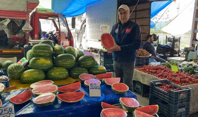 Pazarcı Mehmet Akça, "Sezonun ilk karpuzunu satışa sunduk. Daha ekonomik olsun diye dilim dilim yaptık. Yarım ve çeyrek müşterilerimize sunuyoruz. Çok tatlı bir karpuz, fiyatı çok uygun. Şu anda kilogramı 50 liradan satıyoruz. Herkes de çok memnun, iyi de rağbet var" dedi.